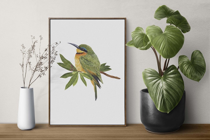 This hand-painted watercolor captures the vibrant colors of the European bee-eater. Exotic yet native, this bird brings a special atmosphere into your home – whether in the living room, bedroom, or study. A unique, nature-inspired decoration that enhances any interior with its delicate details and fresh color palette.