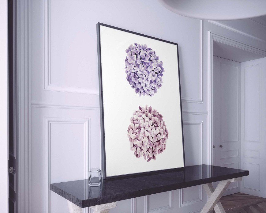 Their rounded blooms and cool tones create a romantic yet fresh effect – perfect for bedrooms or living rooms. The delicate brushstrokes of the watercolor technique add soft transitions and natural texture to the design, filling any interior with an elegant yet lively atmosphere.