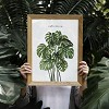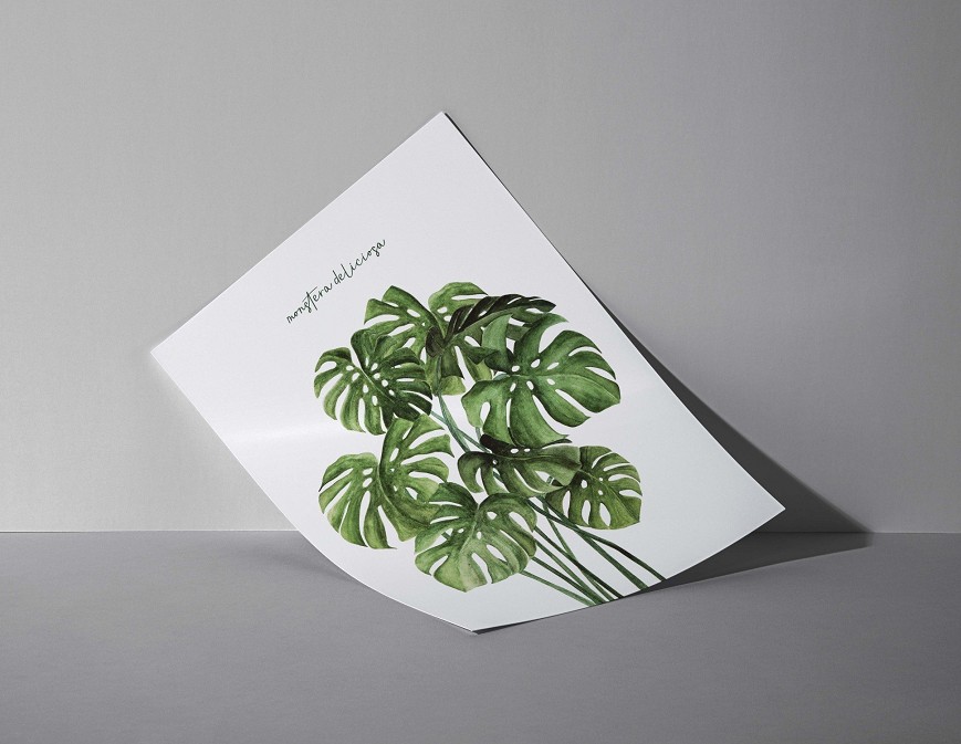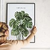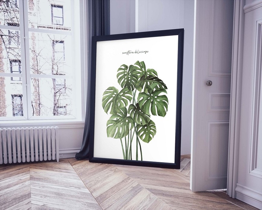 The Monstera plant, with its distinctive perforated leaves, is elegantly captured in watercolor, showcasing natural green shades and detailed structure. It brings a fresh, nature-inspired atmosphere to living rooms, bedrooms, or studies, while conveying a modern, clean style.