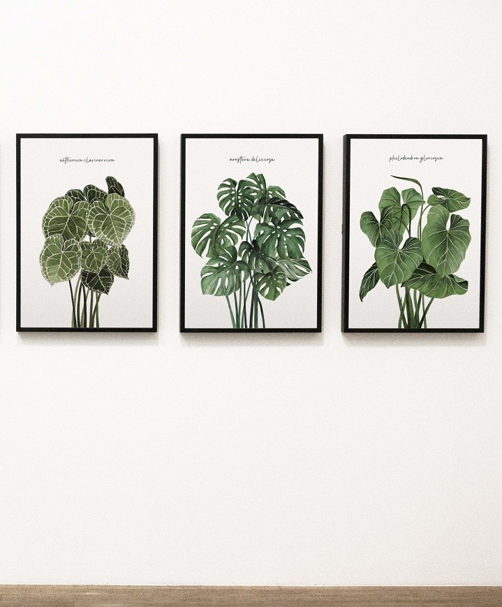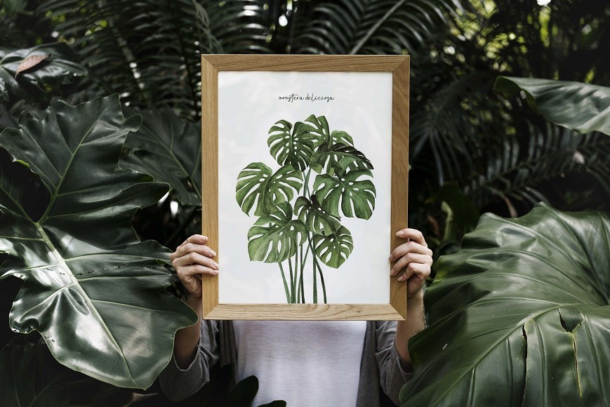 The Monstera plant, with its distinctive perforated leaves, is elegantly captured in watercolor, showcasing natural green shades and detailed structure. It brings a fresh, nature-inspired atmosphere to living rooms, bedrooms, or studies, while conveying a modern, clean style.