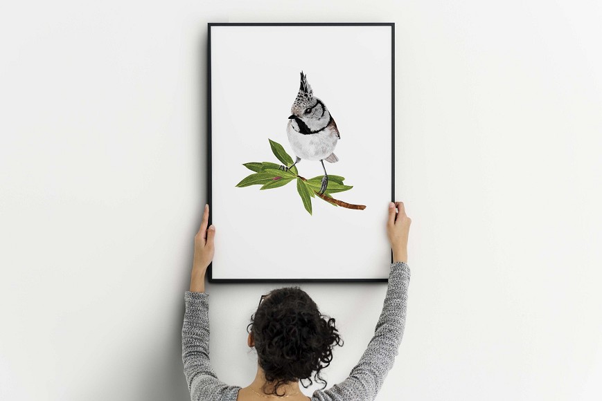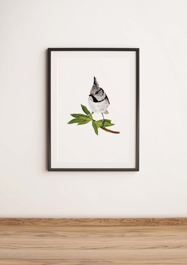 A búbos cinege játékos, mégis finom megjeleníésű – egyik bájos hazai énekesmadarunk. Jellegzetes bóbitájával és élénk természetével egy kis erdei hangulatot varázsol otthonába. Természetrajzi részletességgel és szeretettel festve, egyedi, természetközeli dekoráció bármely enteriőrbe.