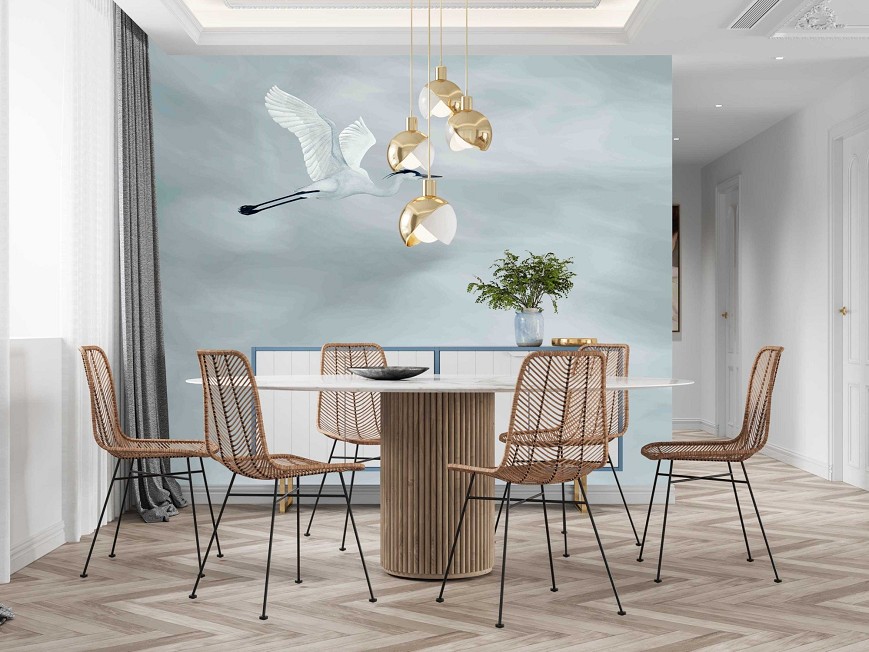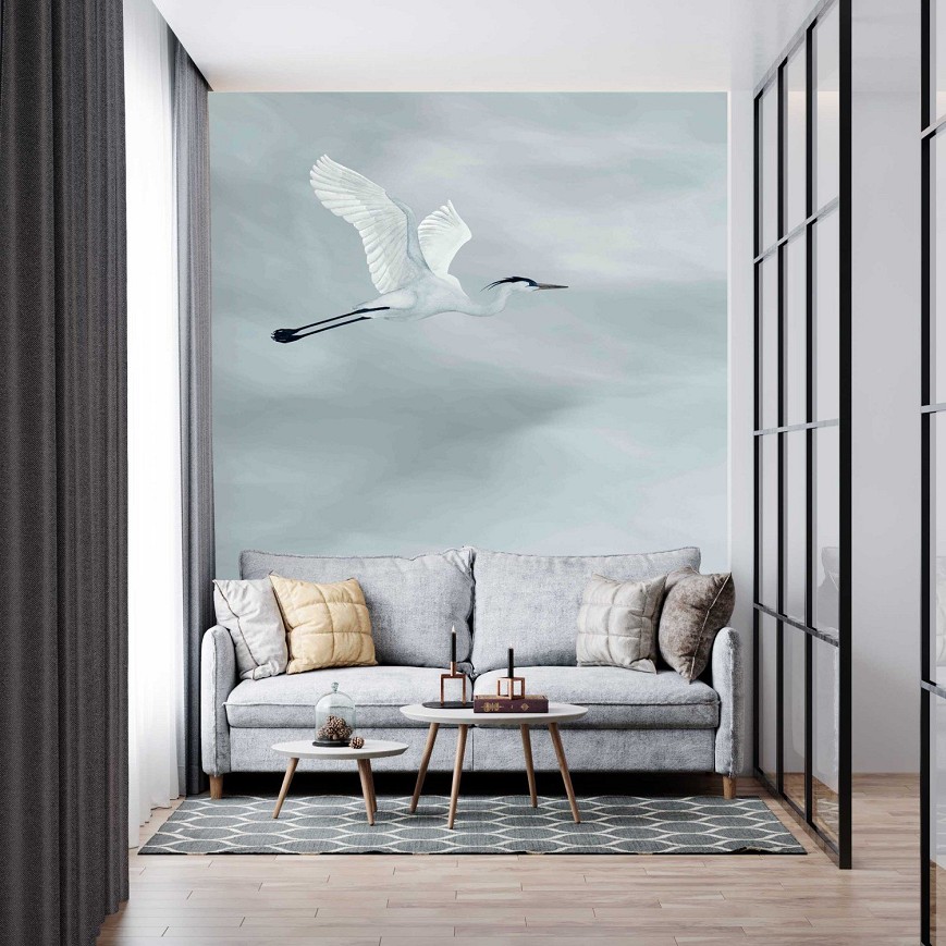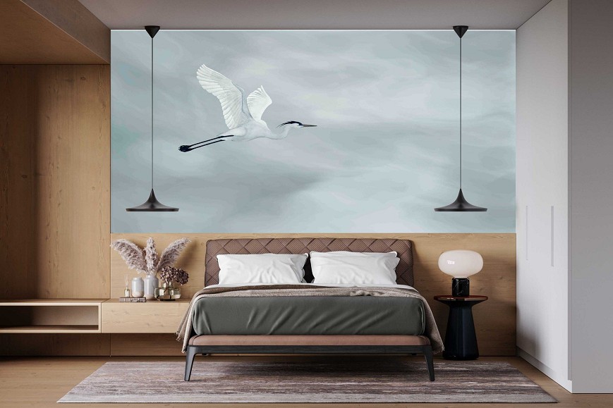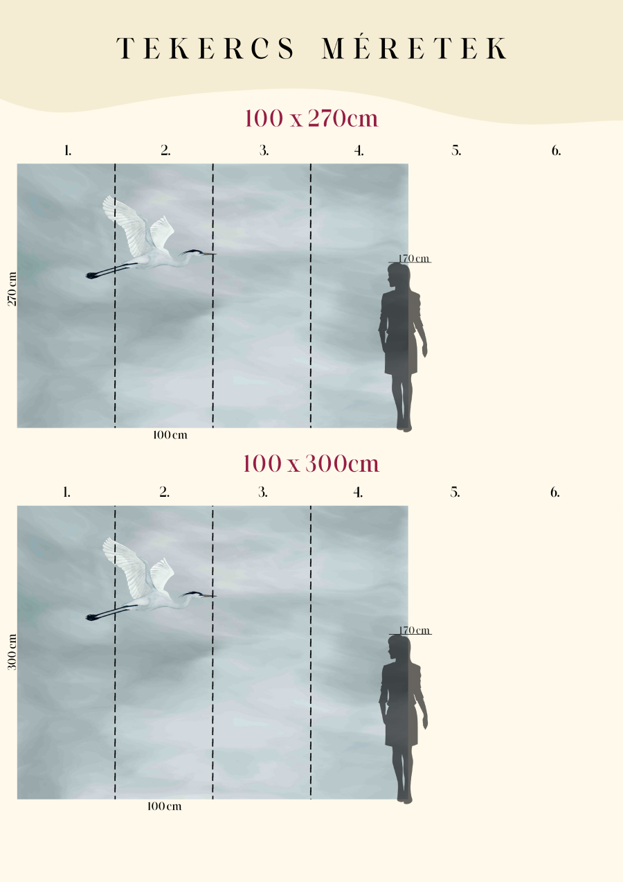 A madarak visszatérő elemei munkáimnak. A szürkegém áramvonalas repte és az eget szimbolizáló háttér lágy hullámzást alkotnak, amivel egy kis mozgást vihetünk a térbe. Bármilyen enteriőrbe jól beilleszthető, akár a modern, a skandináv vagy a vintage stílust képviseljük. A világos színű tapéta kitűnő választás lehet hálószobába, nappaliba, étkezőbe vagy akár kávézók, szálláshelységek dekorációjának részeként.