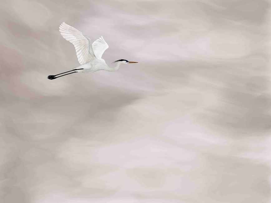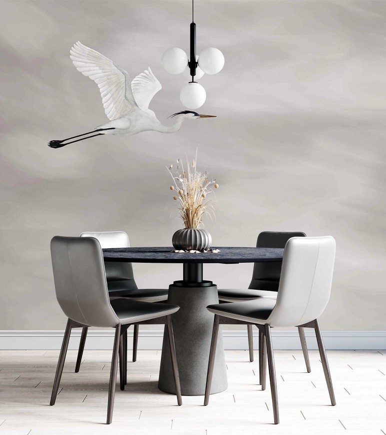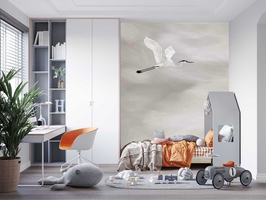 A madarak visszatérő elemei munkáimnak. A szürkegém áramvonalas repte és az eget szimbolizáló háttér lágy hullámzást alkotnak, amivel egy kis mozgást vihetünk a térbe. Bármilyen enteriőrbe jól beilleszthető, akár a modern, a skandináv vagy a vintage stílust képviseljük. A világos színű tapéta kitűnő választás lehet hálószobába, nappaliba, étkezőbe vagy akár kávézók, szálláshelységek dekorációjának részeként.