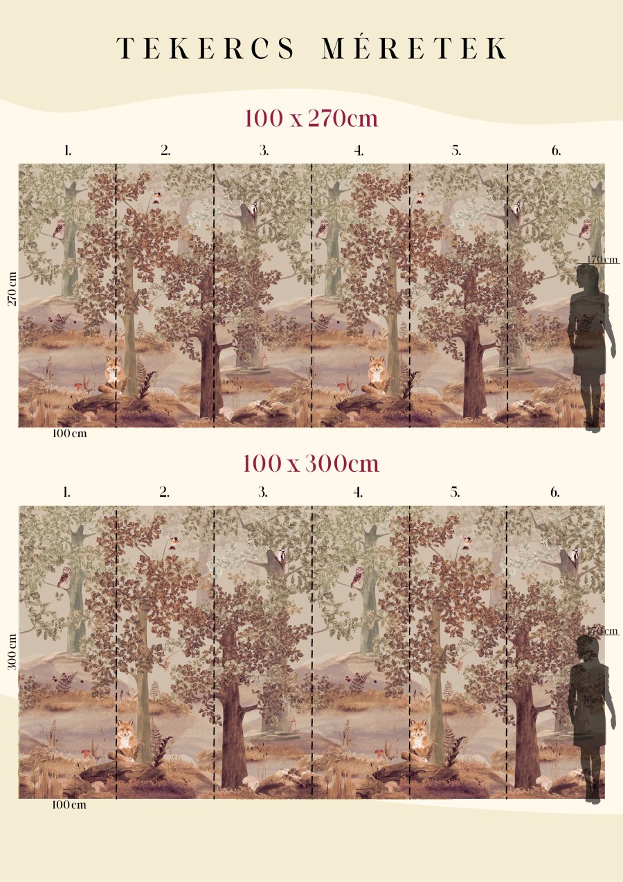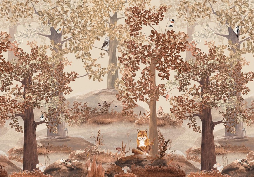 A tölgyfák árnyékában megbújó róka, a magasból figyelő kuvik és harkály, a gombák és a páfrányok mind hozzájárulnak, hogy varázslatos erdei hangulatot teremtsenek otthonunkban. Ez az egyedi tervezésű tapéta kitűnő választás lehet vidéki házak, nyaralók kiegészítőjeként, de a gyerekszobákban is mesés miliőt varázsolhatunk vele.(A minta megtalálható a Falmatricaként is kör formára szabva, öntapadó változatban)