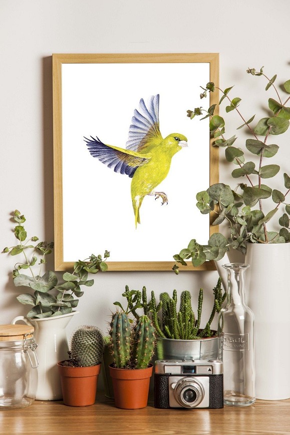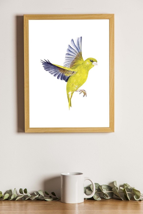 Hazai madarunk élénk zöld tollazattal – finom, természetközeli hangulatot árasztó festmény, amely frissességet visz a térbe. A repülő zöldike kecses szárnycsapásaival és könnyed röppenő mozdulataival valósághűen idézi meg a madár élénk életét, így nappalik, hálószobák vagy gyerekszobák dekorációjaként is ideális.