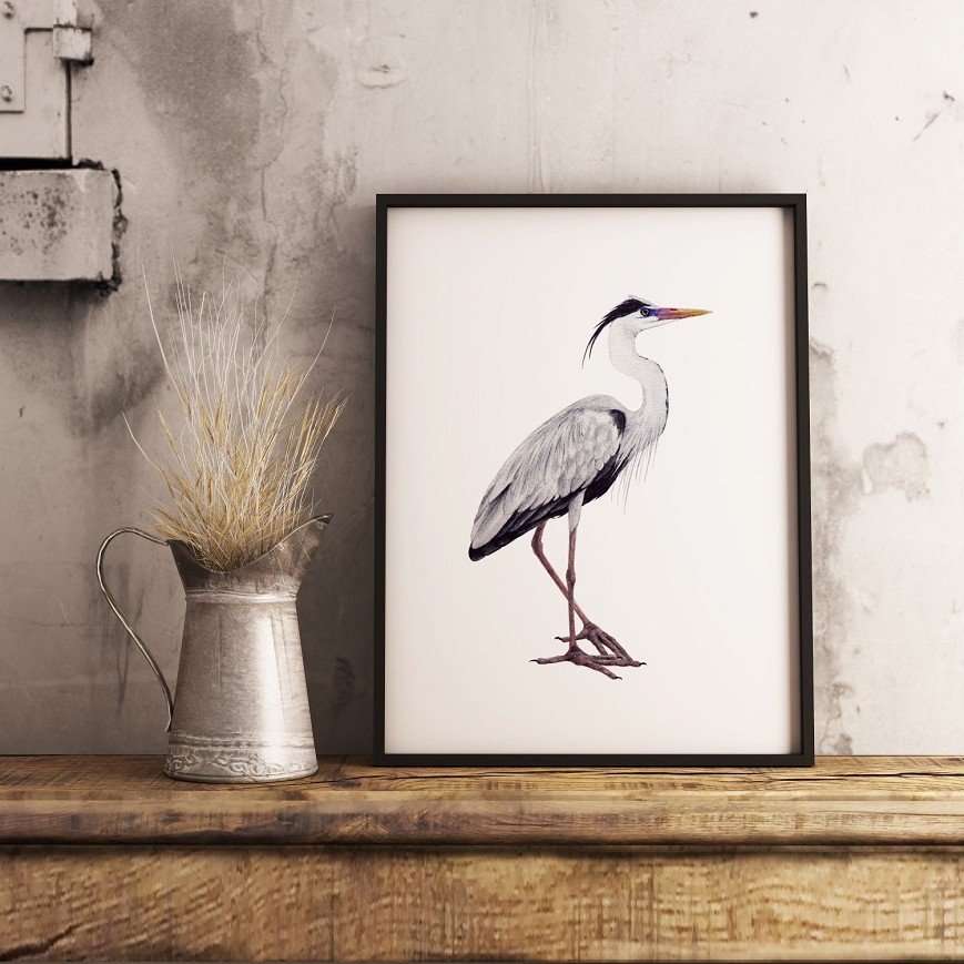 A vízpartok magányos madara elegáns pózban, finom szürkékkel és kékekkel – visszafogott, mégis karakteres akvarell. Az álló szürkegém kecses nyakát és hosszú lábait bemutatva, nyugodt és méltóságteljes jelenlétet áraszt, ami különleges hangulatot kölcsönöz minden enteriőrnek.