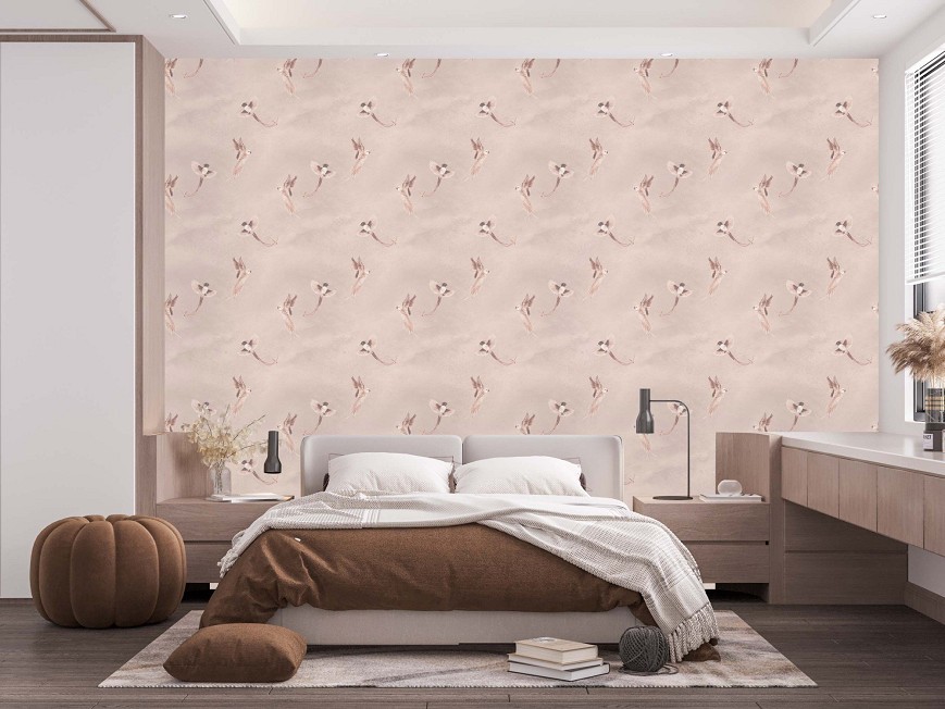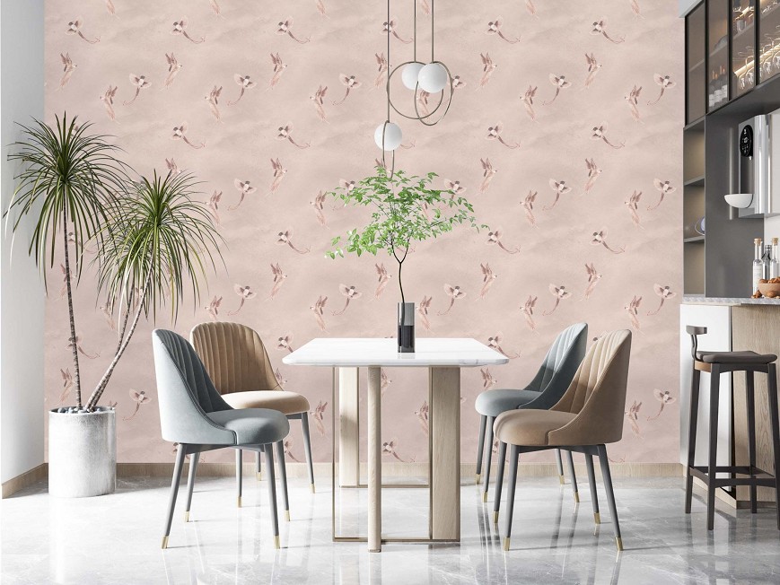 A madarak visszatérő elemei munkáimnak. Minden alkalommal rácsodálkozok a változatosságukra, ami folyamatos inspirációt ad a festéshez. Ennél a mintánál a madarak reptének áramlása adott inspirációt, ez visz lendületet és vidámságot a térbe. Ez a madár mintás tapéta harmonikus kiegészítője lehet nappaliknak, hálószobáknak, dolgozószobáknak, de kávézók és közösségi terek dísze is lehet.