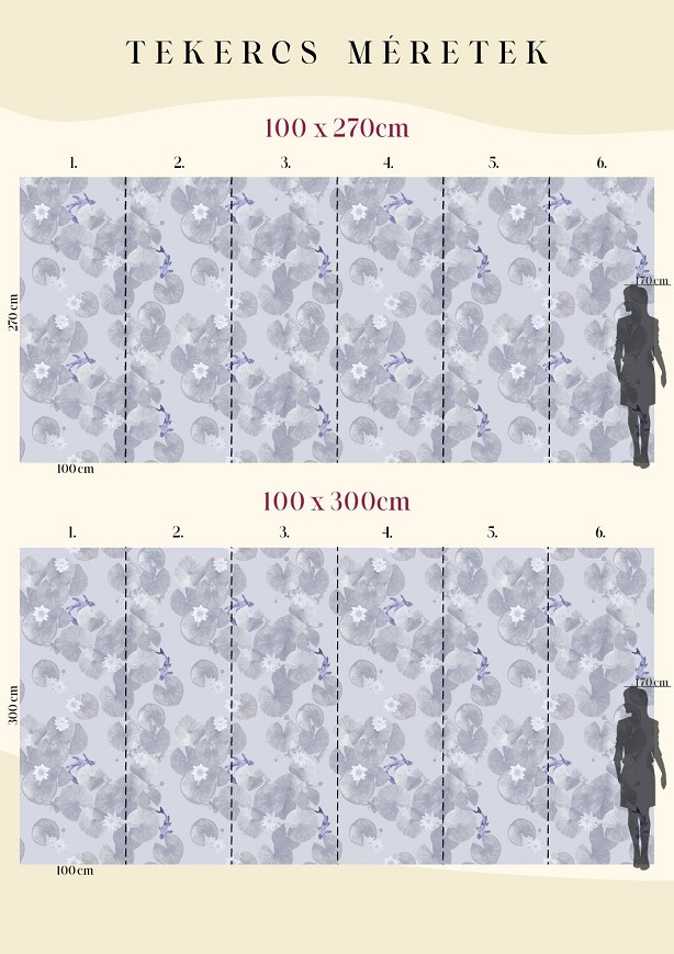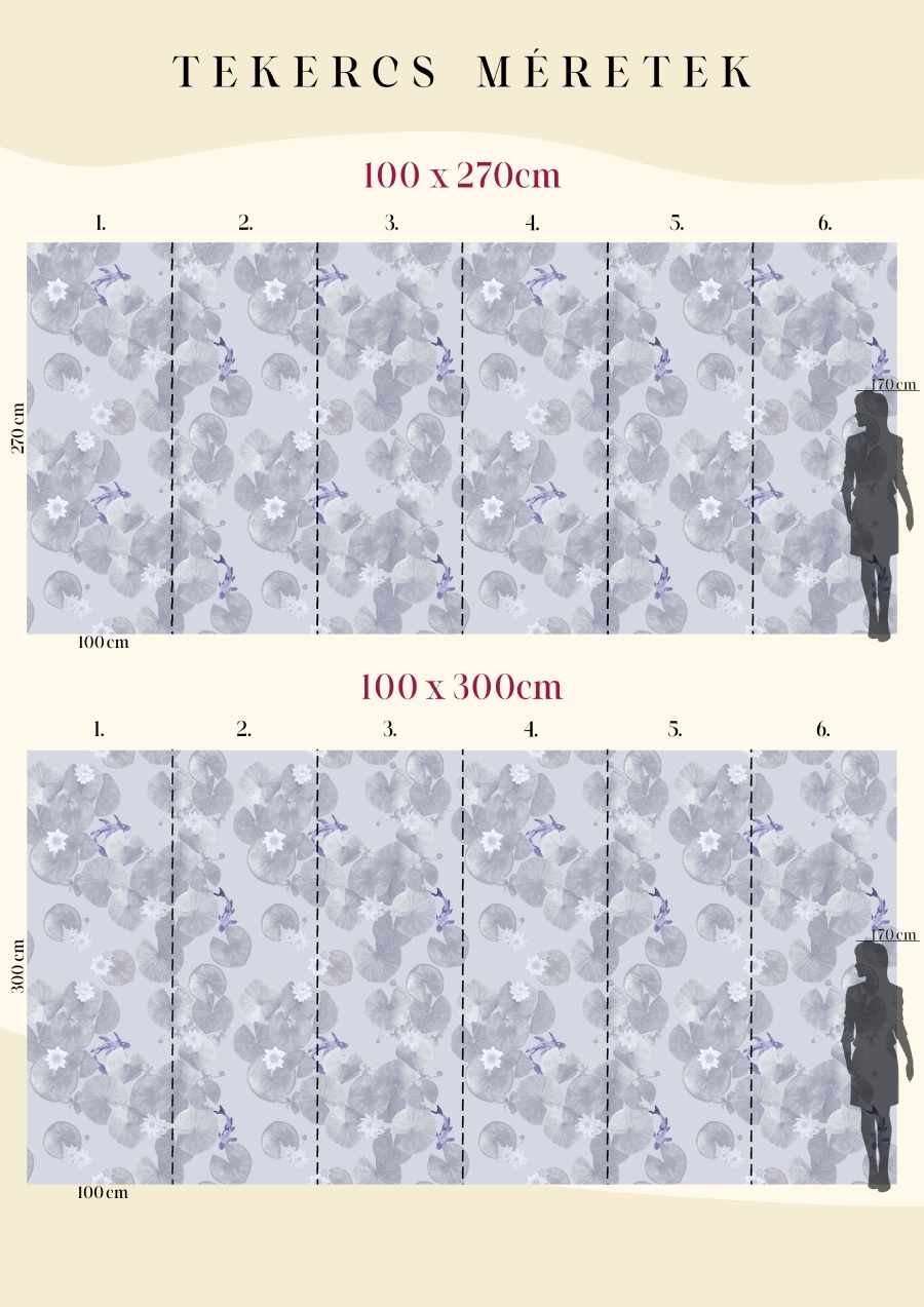 Az ázsiai kultúra két meghatározó motívuma a lótusz és a koi hal, melyek külön-külön is rengeteg szimbolikus jelentést hordoznak magukban. Ezek az energiák egyesülnek ebben a mintában is, így a tisztaság, a jövő iránti optimizmus, a siker, és az erő fogja átjárni az otthonunkat. A minta választható virágokkal, halakkal vagy csak levelekkel, többféle színvariációban. A sötét és színes változatok meglepő és hatásos enteriőröket hoznak létre, míg a pasztell árnyalatúak különleges hátteret varázsolnak.