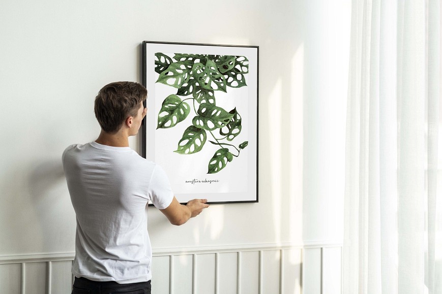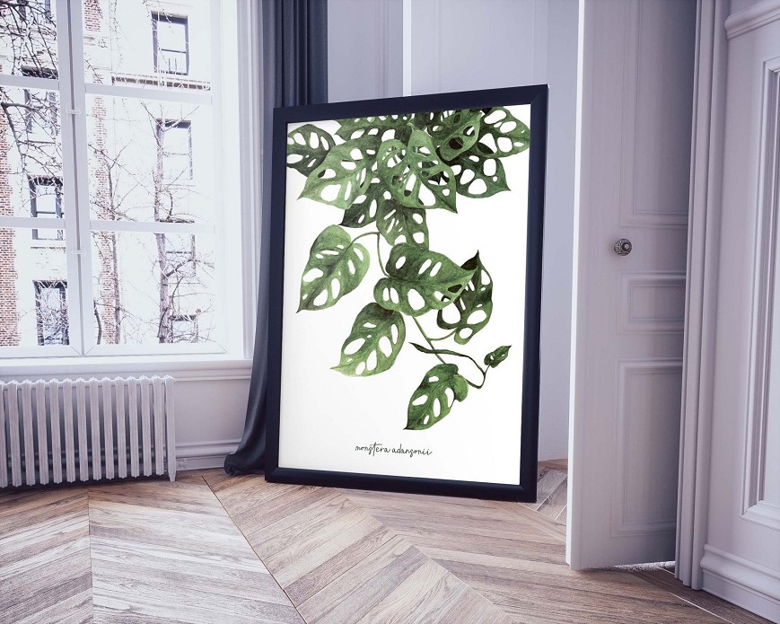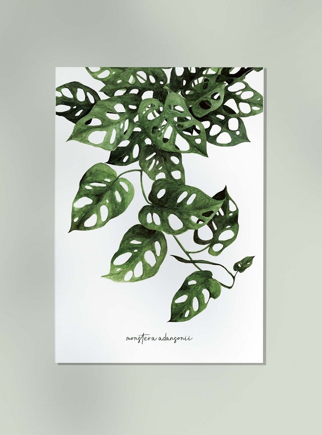 A lyukacsos levelű monstera faj különleges szerkezete modern, minimalista enteriőrbe illő akvarell formában jelenik meg. A finom ecsetvonások és lágy árnyalatok kiemelik a növény jellegzetes formáit, miközben friss, természetközeli hangulatot kölcsönöznek a nappalinak, hálószobának vagy dolgozószobának.
