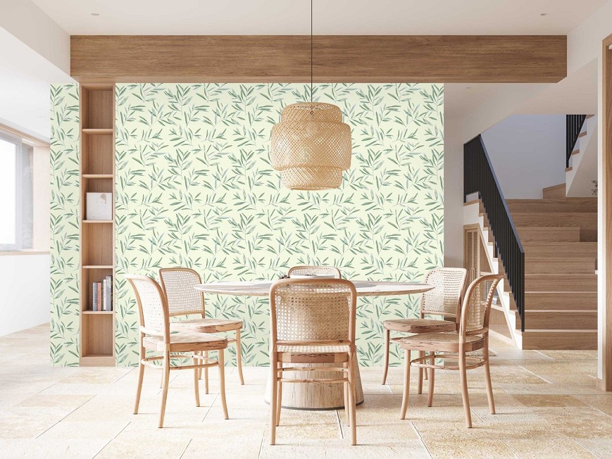 Az olajfa levél mintás tapéta a harmonikus és letisztult terek kedvelőinek készült. Ez a minta kellemes kiegészítője lehet hálószobájának, nappalijának, étkezőjének, de gyerekek szobájába is szívesen ajánlom. A levelek és a pasztellszínek nyugodt hangulatot teremtenek.