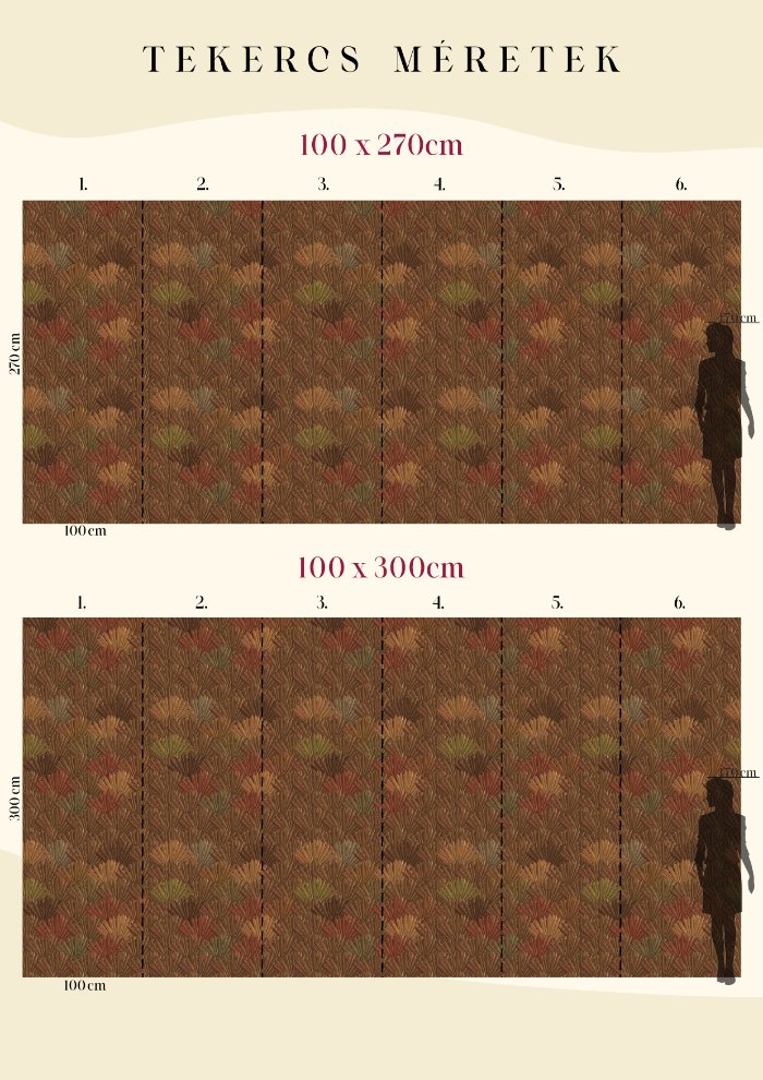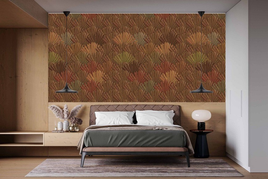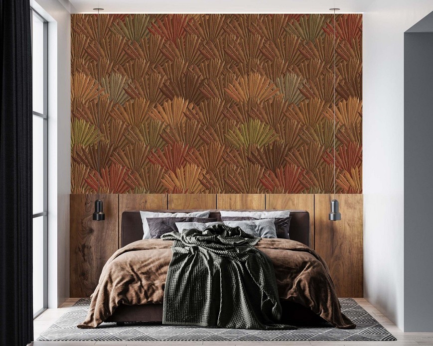A pálmalevelek ismétlődése strukturált felületet képez a falon, messziről nézve térbeli formákat alkot. A levelek összessége absztrakt látványt nyújt, különösen jól mutat textilvászon hatású tapéta anyagon. Ez a levélminta, kiválóan illik elegáns és minimál enteriőrökbe, de akár vintage designnal is párosítható. A pasztellszínek mellett sötétebb zöld és barna színben is izgalmas hatást érhetünk el velük.