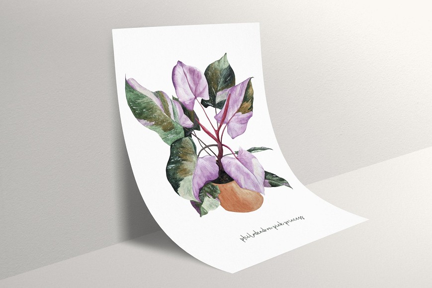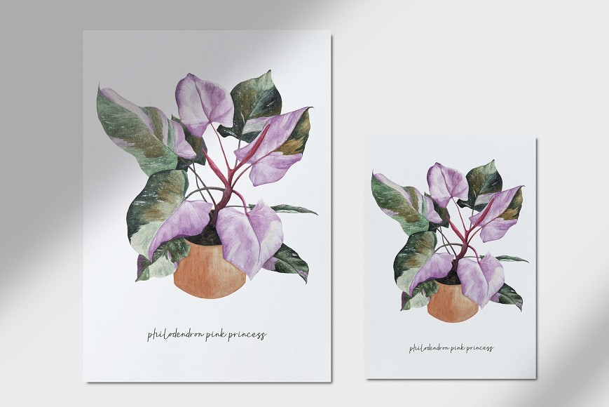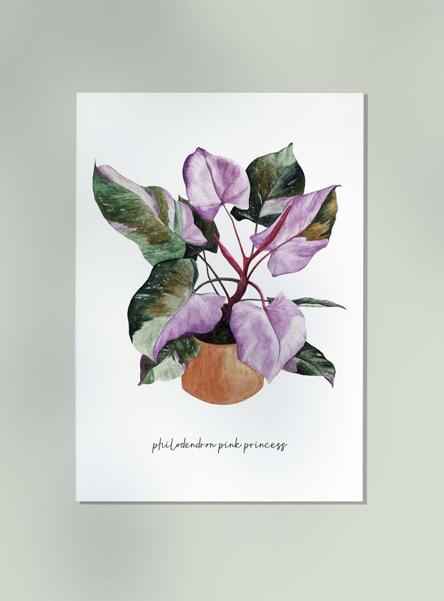 A Philodendron ‘Pink Princess’ jellegzetes, rózsaszín foltos levelei különleges, egzotikus hangulatot varázsolnak az enteriőrbe. Akvarell formában megfestve a levelek finom részletei és kontrasztos színei kiemelik a növény egyedi szépségét, friss és természetközeli hangulatot adva nappaliknak, hálószobáknak vagy dolgozószobáknak.