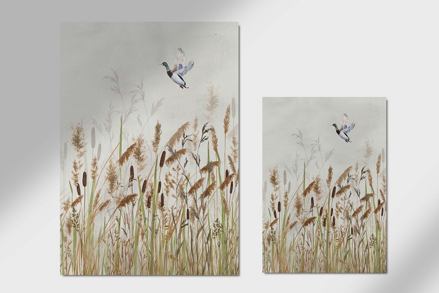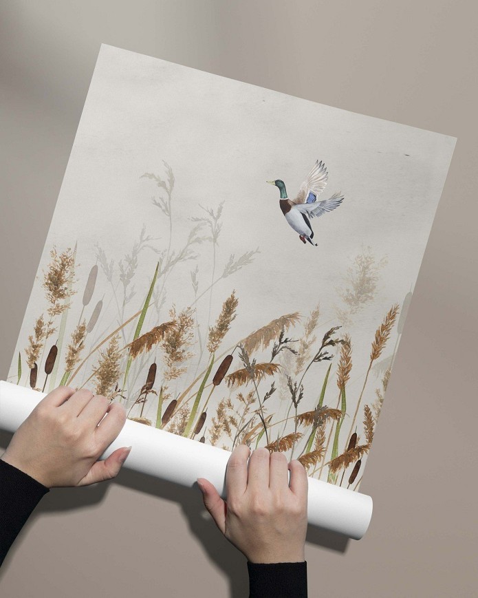 A nyugodt vízparti hangulatot idéző festményen egy kacsa pihen a nádasban, finom ecsetvonásokkal és lágy színekkel ábrázolva. Természetközeli, harmonikus dekoráció, amely harmóniát visz nappalikba, hálószobákba vagy gyerekszobákba.