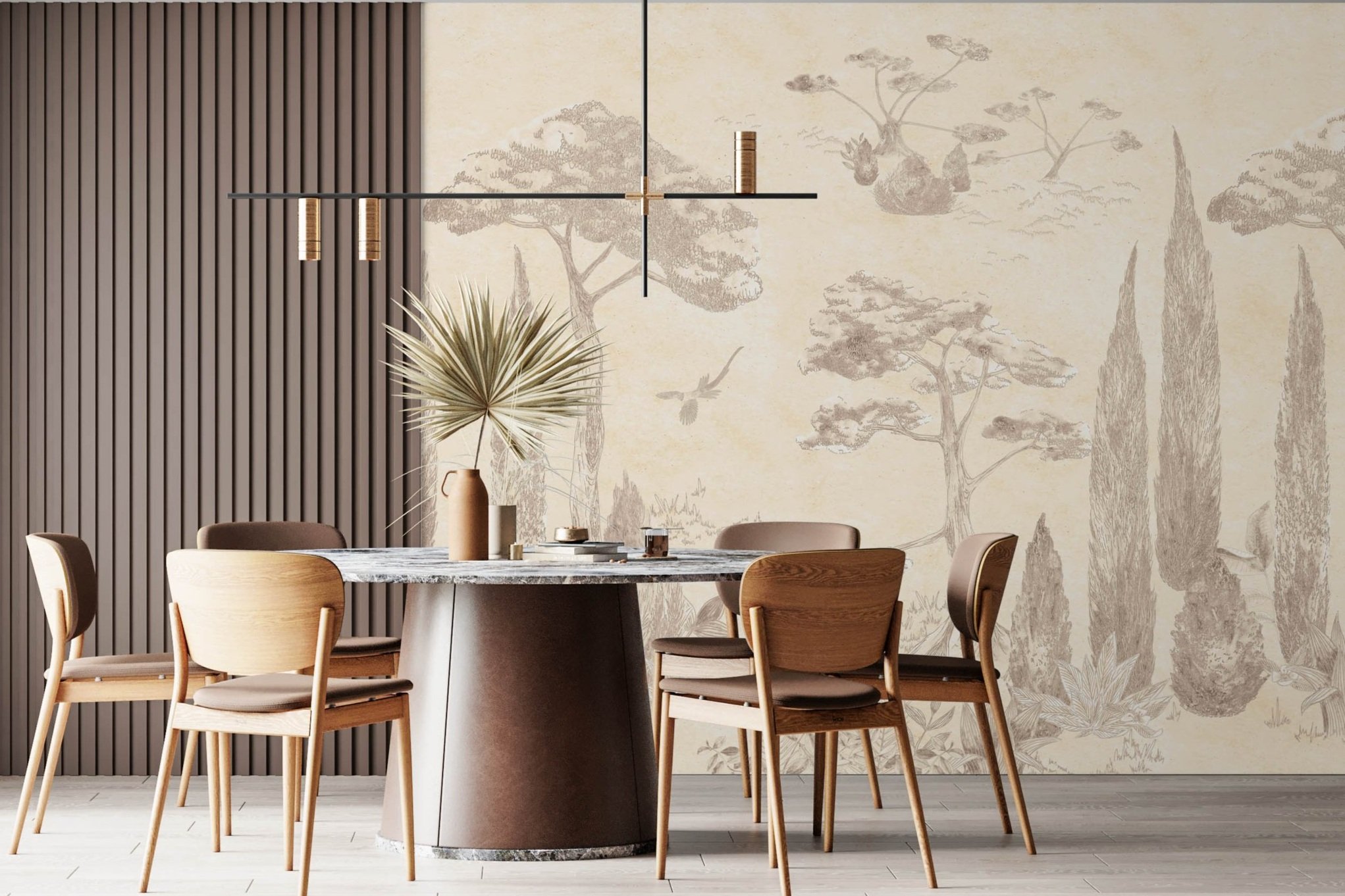 A természet ihlette minták és a pasztell árnyalatok egységes képi világot alkotnak és jól beilleszthetők minden enteriőrbe. Kérhető többféle textúrájú tapétára, hogy a végeredmény tökéletes kiegészítőjévé vagy meghatározó elemévé váljon a tereknek.